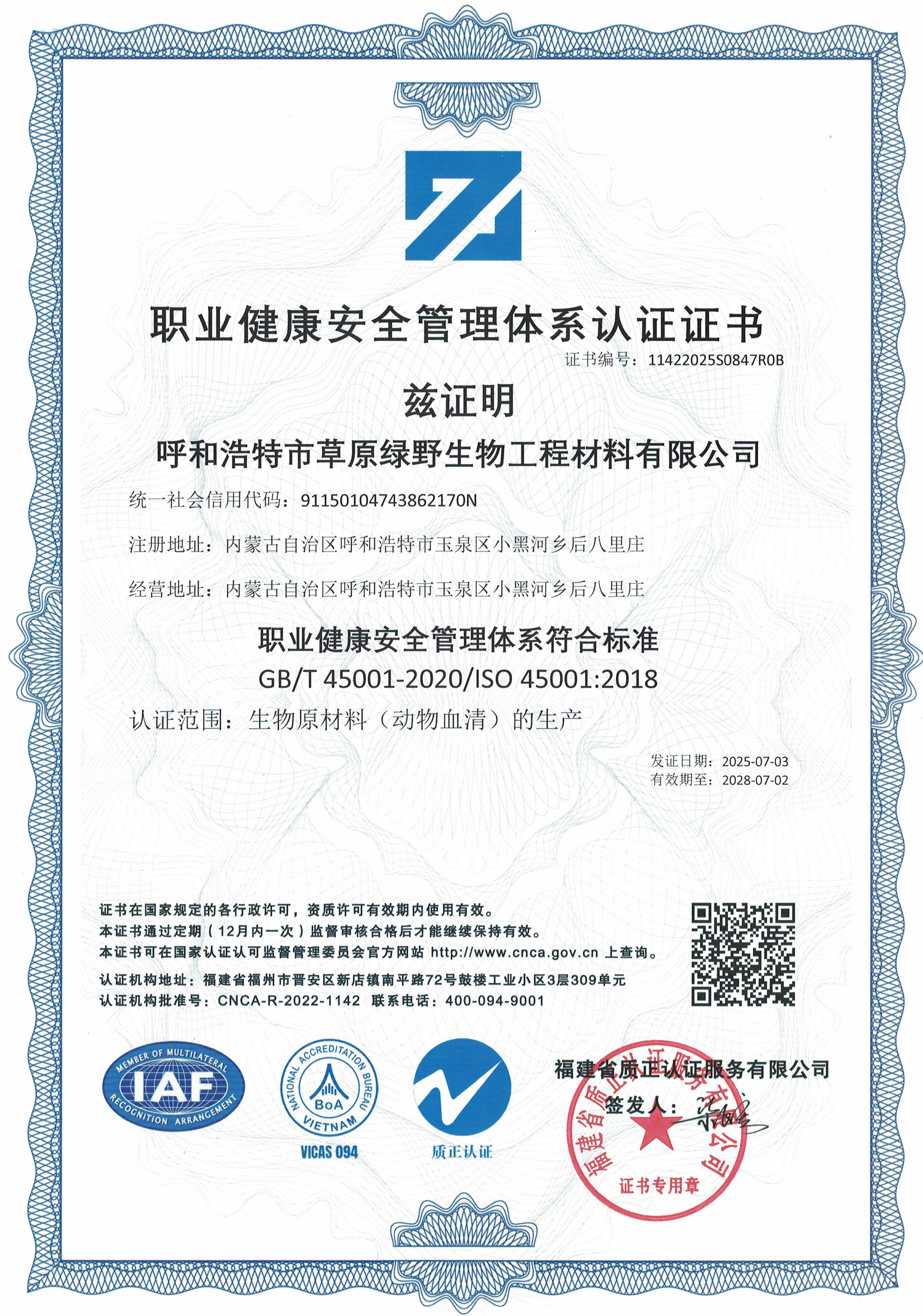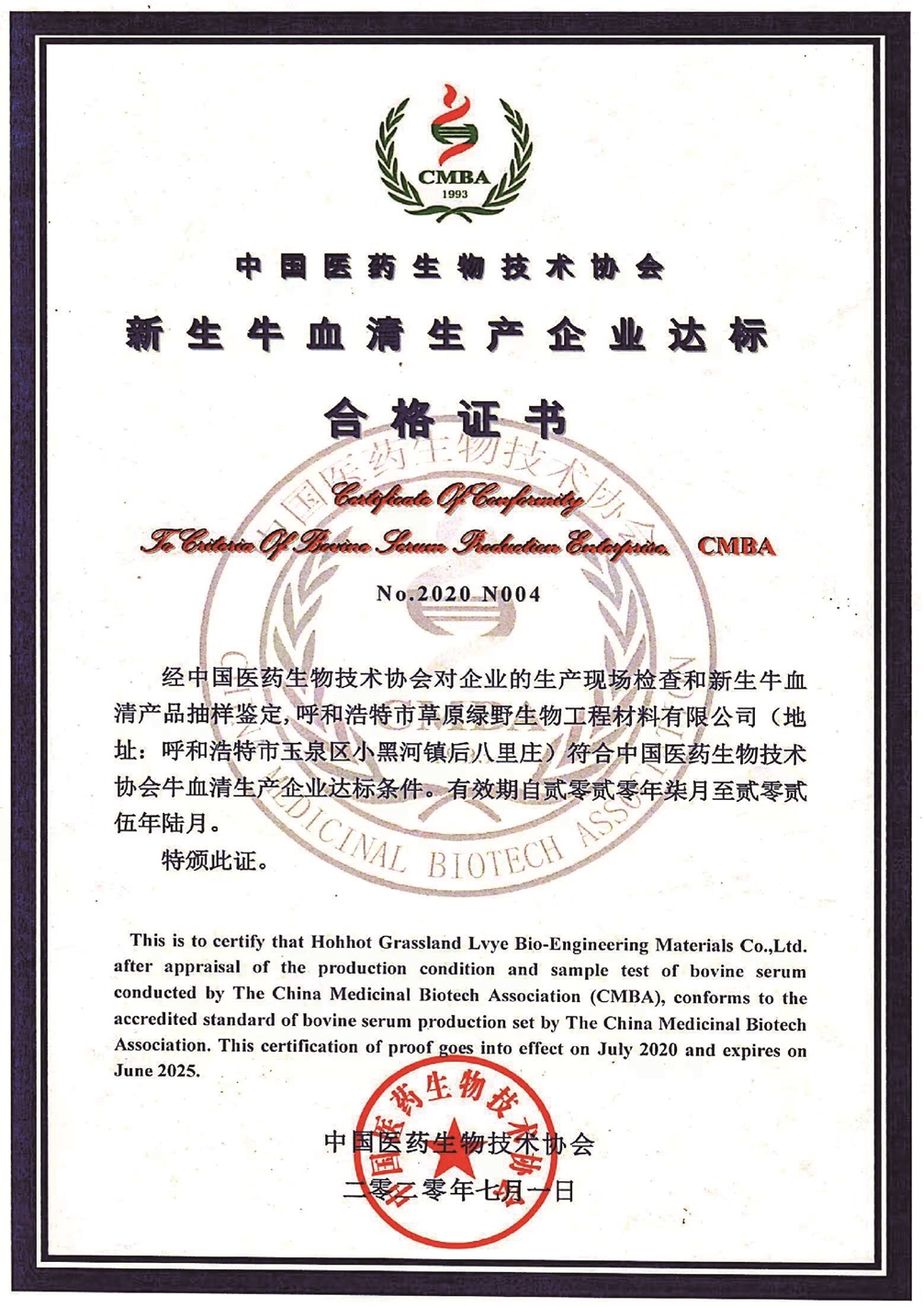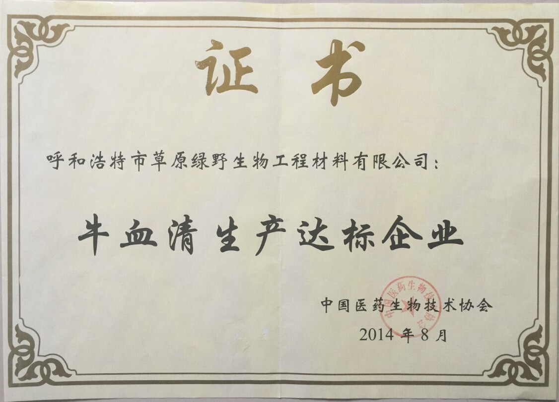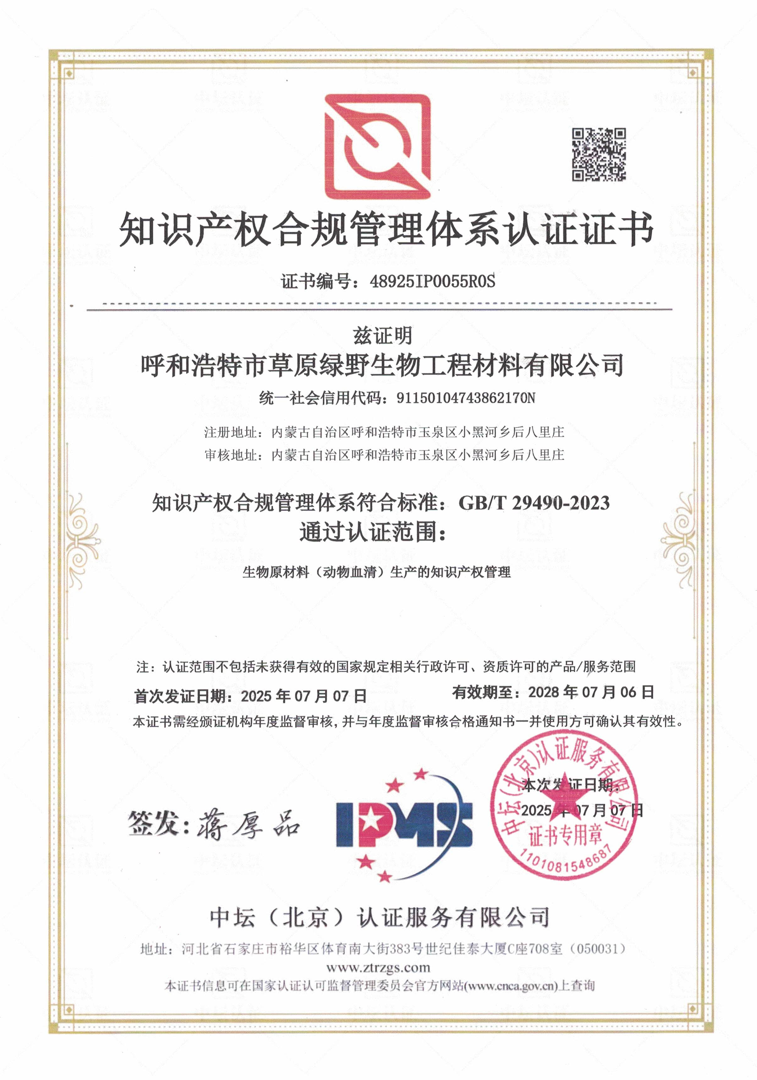 公司至今已多次通過中國醫(yī)藥生物技術(shù)協(xié)會(huì)《牛血清生產(chǎn)企業(yè)達(dá)標(biāo)》認(rèn)證、《牛血清生產(chǎn)質(zhì)量達(dá)標(biāo)企業(yè)》認(rèn)證。ISO9001質(zhì)量管理體系認(rèn)證、ISO45001職業(yè)健康安全管理體系認(rèn)證、ISO14001環(huán)境管理體系認(rèn)證、ISO13485醫(yī)療器械質(zhì)量管理體系認(rèn)證、ISO50001能源管理體系認(rèn)證、GB/T29490知識(shí)產(chǎn)權(quán)合規(guī)管理體系認(rèn)證、AAA級(jí)信用企業(yè)認(rèn)證、A級(jí)納稅單位評(píng)審等。