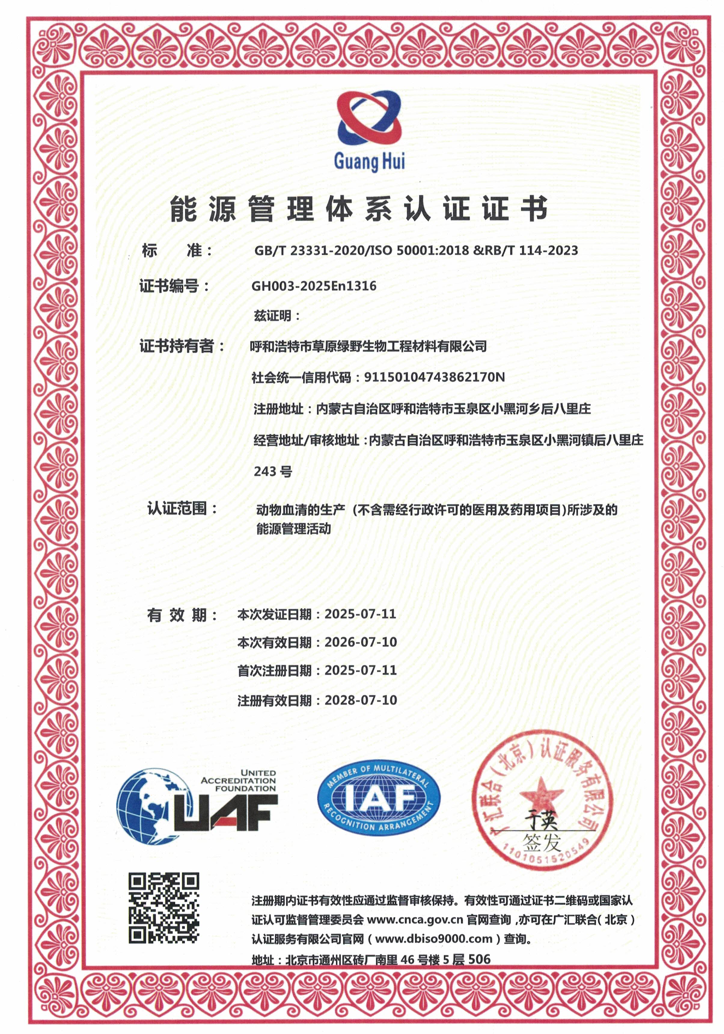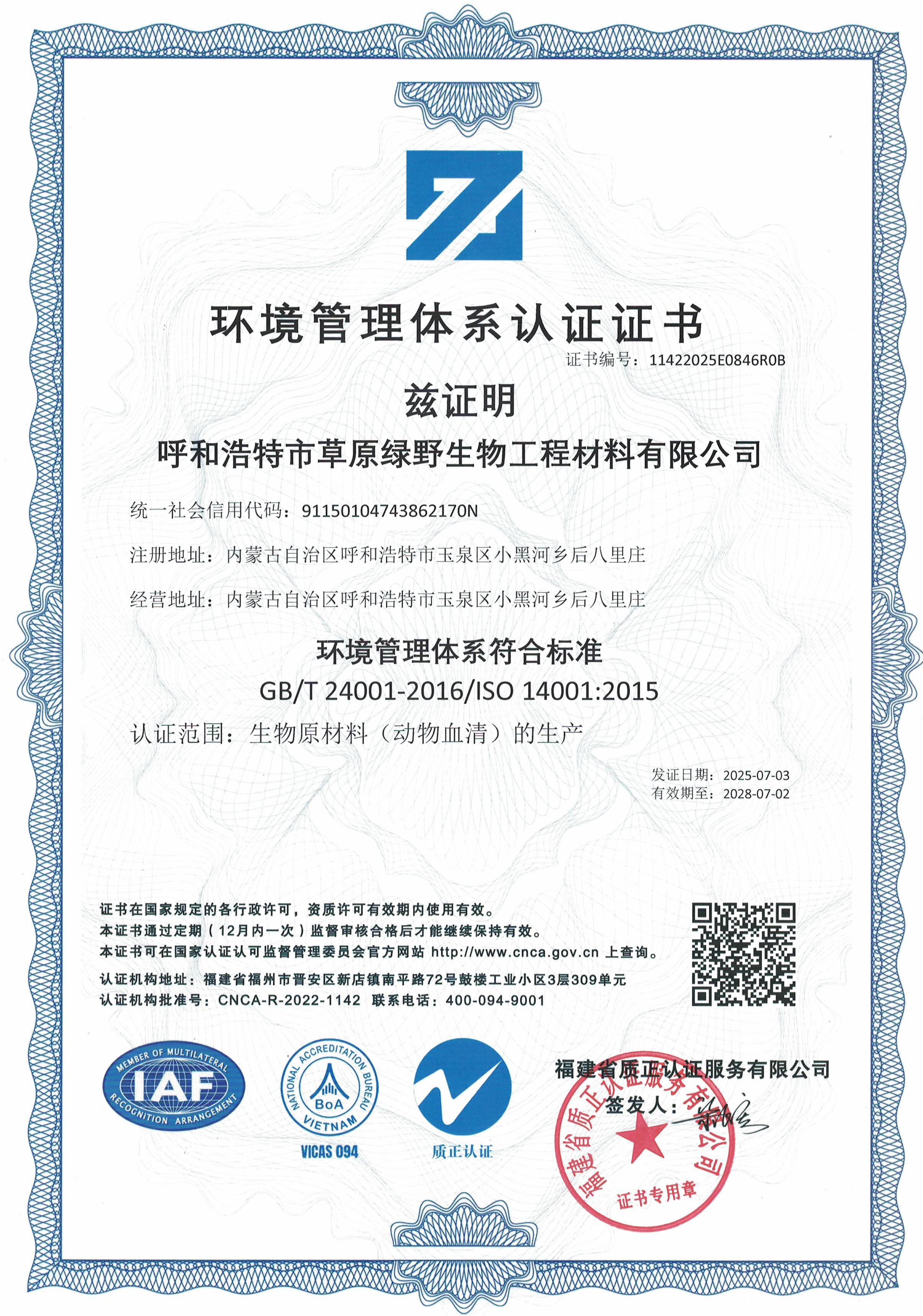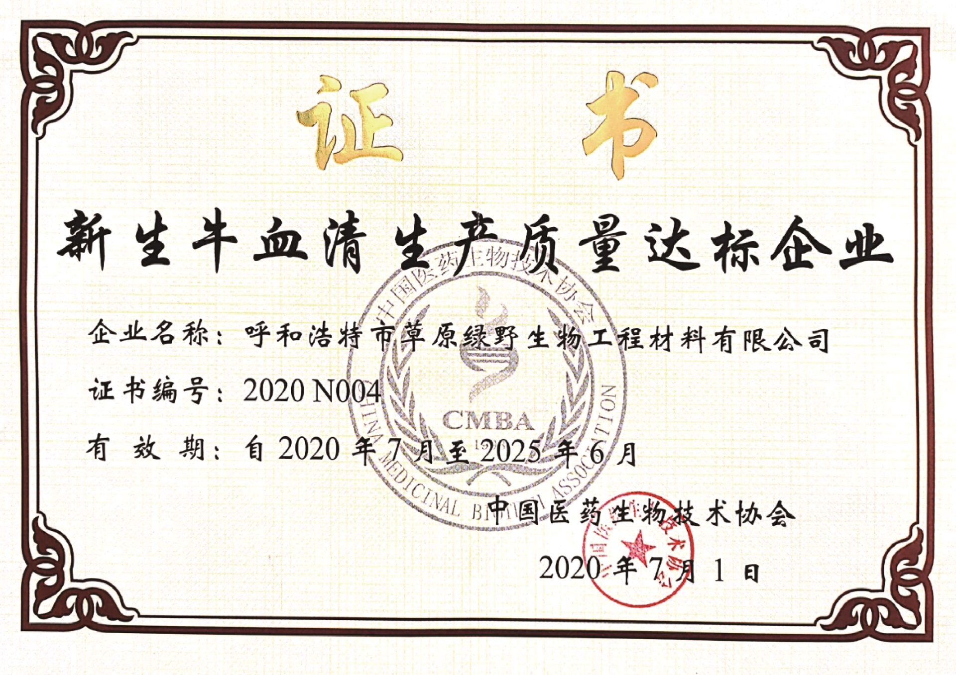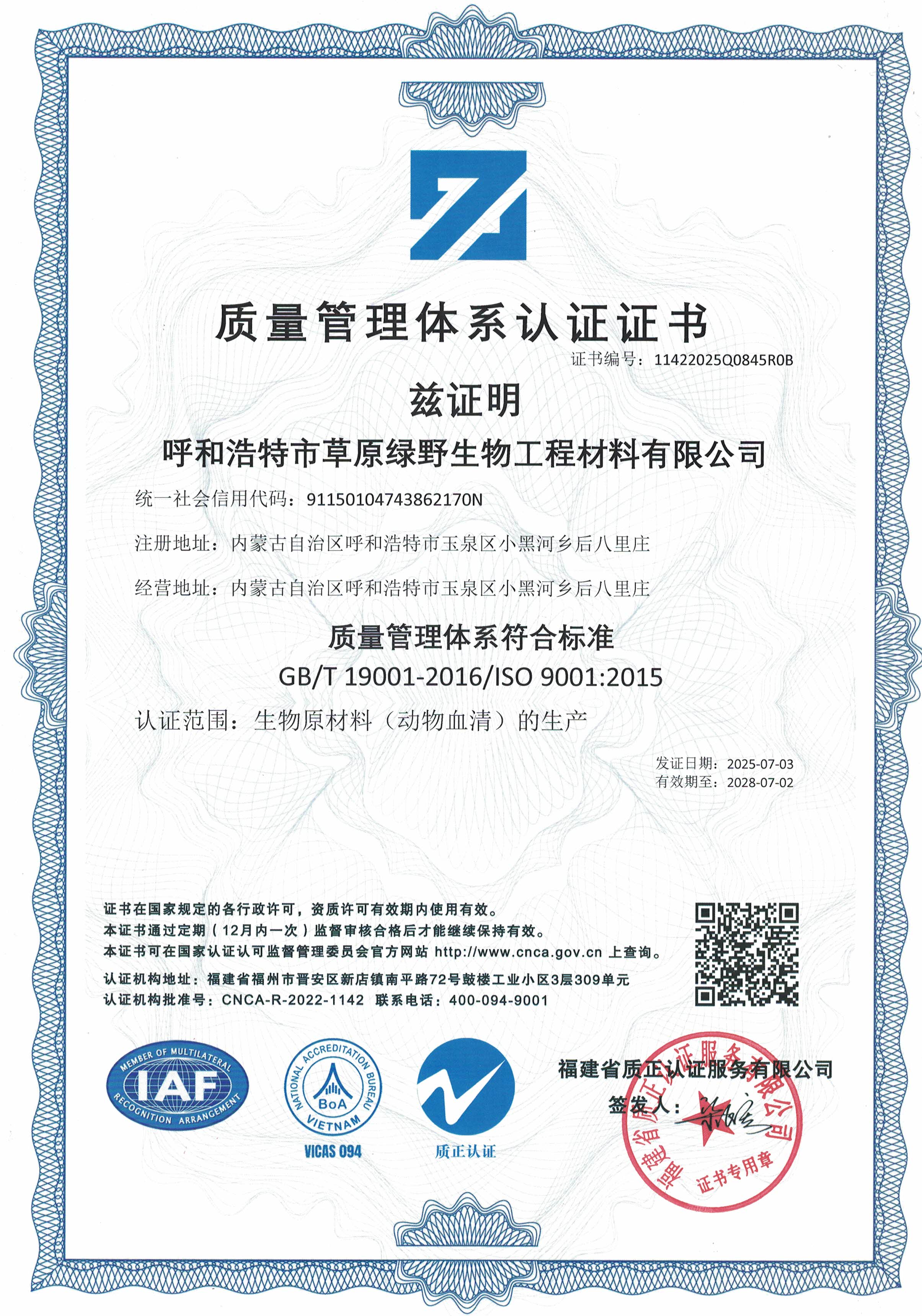 公司至今已多次通過中國醫(yī)藥生物技術(shù)協(xié)會(huì)《牛血清生產(chǎn)企業(yè)達(dá)標(biāo)》認(rèn)證、《牛血清生產(chǎn)質(zhì)量達(dá)標(biāo)企業(yè)》認(rèn)證。ISO9001質(zhì)量管理體系認(rèn)證、ISO45001職業(yè)健康安全管理體系認(rèn)證、ISO14001環(huán)境管理體系認(rèn)證、ISO13485醫(yī)療器械質(zhì)量管理體系認(rèn)證、ISO50001能源管理體系認(rèn)證、GB/T29490知識(shí)產(chǎn)權(quán)合規(guī)管理體系認(rèn)證、AAA級(jí)信用企業(yè)認(rèn)證、A級(jí)納稅單位評(píng)審等。